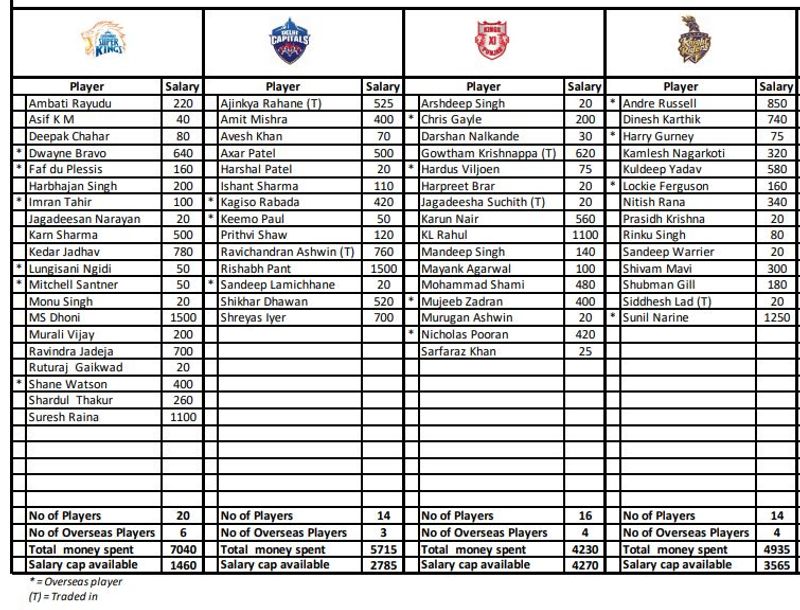 | Franchise | No. of Players | No. of Overseas Players | Total money spent (Rs.) | Salary cap available (Rs.) | Available slots | Overseas slots |