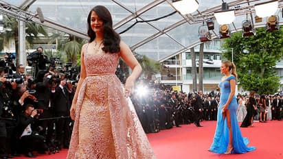 For her first appearance at the ongoing festival, the Jazbaa actress opted for a studded champagne coloured couture gown by Kuwait's designer Ali Younes. Aishwarya experimented with a metallic sheath overlaid by a sparkly floor-length cape. She wore her hair in loose waves.