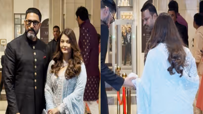 For the occasion, Aishwarya chose an elegant blue anarkali ensemble, while Abhishek complemented her look with a black kurta paired with white trousers. The couple smiled and acknowledged the cameras before heading inside to join the celebrations.