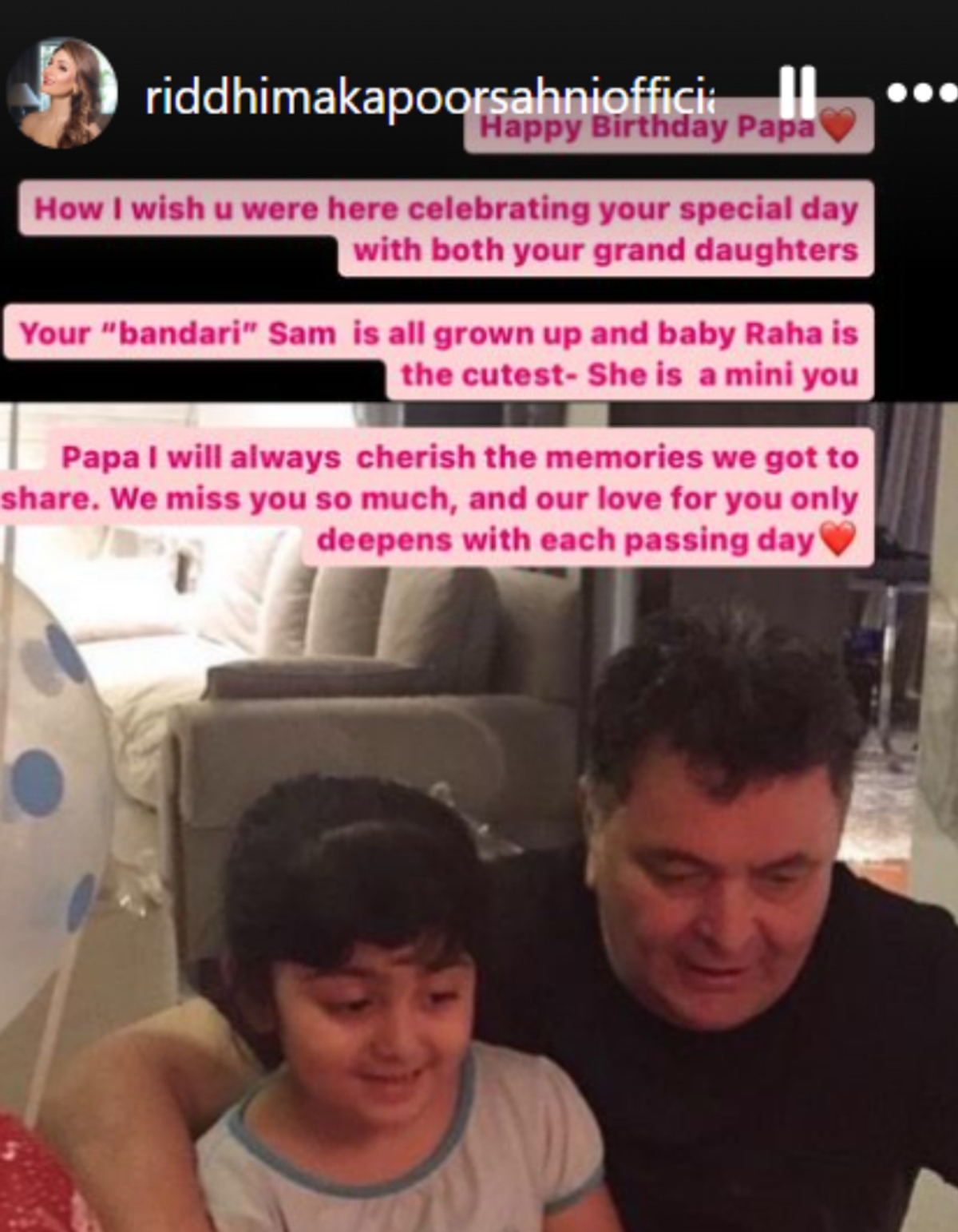On her Instagram stories, Riddhima expressed her emotions, wishing her father a happy birthday and lamenting his absence on such a special day. She noted that Samara, her daughter, has grown up, and baby Raha resembles her late grandfather. Riddhima mentioned how she will always cherish the memories they shared and how much the family misses him, with their love for him deepening with each passing day. The accompanying photo showed Rishi Kapoor sitting with his granddaughter, attempting to blow out candles.