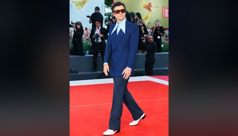 Although ‘Don’t Worry Darling’ is a film that has been set in the 1950s, Harry Styles's wardrobe has taken inspiration from the fashion that was prevalent in the 1970s; Alessandro Michele’s designs are inspired by the era of the 1970s. The turquoise suit was not the only retro-inspired look of Styles. Hours before he walked the red carpet, Styles was seen wearing tailored Gucci navy flares and a striped blazer over a vest. He completed the look with a jaunty neck scarf.
