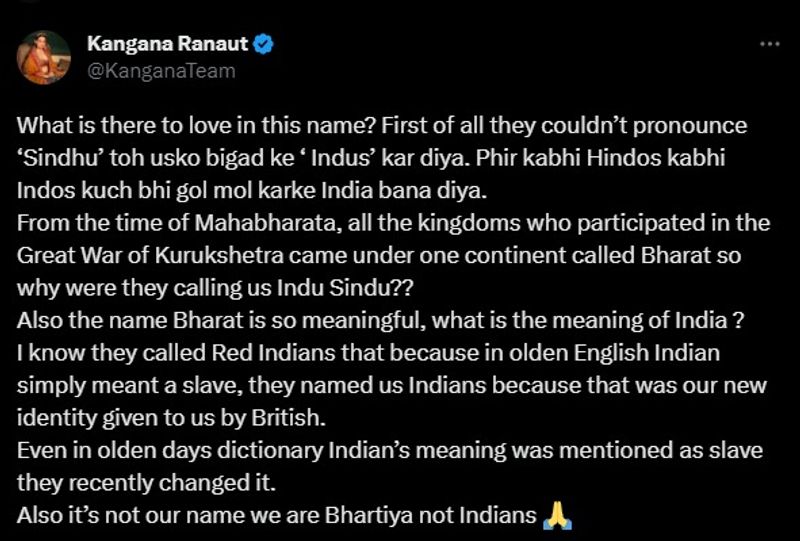 Kangana took to X (previously known as Twitter), and said she favoured the renaming. The actress reminded fans that she had expressed her views on renaming the nation two years ago and still passionately supporting the cause. She asserted that the nation's residents were referred to as Indians because 'that was our new identity given to us by the British.' She went on to say that the word Bharat is 'meaningful,' while the term India is meaningless.