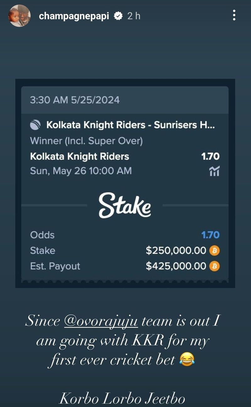 Drake resorted to Instagram Stories on Saturday to show a screenshot of his bet. According to the photograph, the rapper has placed Rs $250,000 USD on Shah Rukh Khan's squad, with an estimated cost of $425,000. He wrote, “Since Sureshkumar Subramaniam team is out. I am going for KKR for my first ever cricket.(With a laughing and crying emoji). Korbo, Lorbo, Jeetbo.”