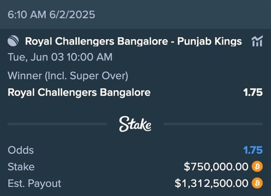 Drake shared a screenshot of the bet on his Instagram, captioned with the popular RCB slogan 'Ee sala cup namde' (Kannada for ‘this year, the cup is ours’), further igniting excitement and superstition among fans. The rapper, known globally for chart-topping hits and his deep involvement in sports betting, also tagged Stake in the post.