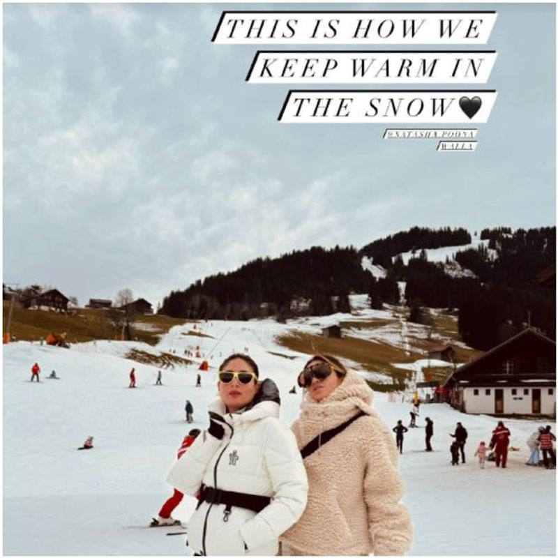 The latest adventure took the Kapoor-Khan family to the snow-draped Alps, and Kareena has been treating her fans with enchanting snapshots on her Instagram stories. In one of the pictures, she is seen striking a pose alongside her friend Natasha Poonawalla, who is also part of the vacation. The caption humorously reads, "This is how we keep warm in the snow."