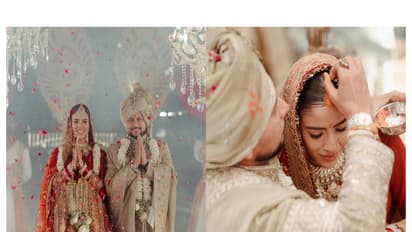 For the main ceremony, the couple opted for a classic North Indian aesthetic. Kuldeep donned a beige-hued golden sherwani with intricate tonal embroidery, complemented by a matching turban featuring a jewelled kalgi. He completed his ensemble with multiple strands of pearl kantha necklaces. Vanshika chose a timeless red lehenga heavily detailed with golden zari work, paired with a traditional red chooda and an ornate golden maang teeka.