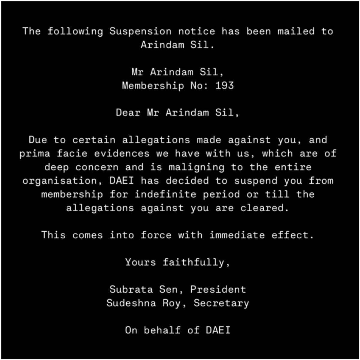 Arindam Sil, in response to the allegations, maintained that he had no ill intentions. He expressed regret if his actions had caused distress but stood by his claim that the act was unintentional. He added that he was seeking legal advice and preferred to leave the matter to time, insisting that the truth was not widely known. Following the actress's complaint, the Directors’ Association of Eastern India (DAEI) suspended Arindam Sil.