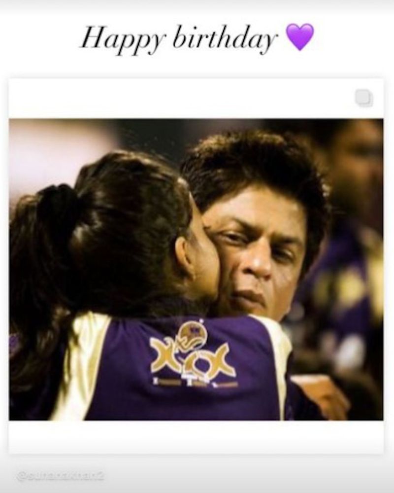 The Archies actress who is set to debut with the Zoya Akhtar directorial shared two Instagram stories on the occasion of her superstar father's birthday. In one of the pictures, Suhana is seen planting a sweet kiss on the cheeks of her father wearing a KKR jersey. The picture is of when Suhana was still a kid. It is to be noted that Shah Rukh Khan is also the owner of IPL team Kolkata Knight Riders and Suhana is often seen accompanying her father cheering for the team from the stands. She shared the story with a purple heart emoji.