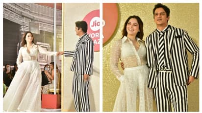 Vijay Varma chose a sleek black and white striped suit, complemented by a matching shirt and tie, and rounded off his look with black shoes. On the other hand, Tamannaah Bhatia looked ethereal in a white see-through dress that perfectly complemented her partner's monochrome outfit. The paparazzi were thrilled by their arrival and happily captured the couple's stylish entrance, much to the delight of their fans.