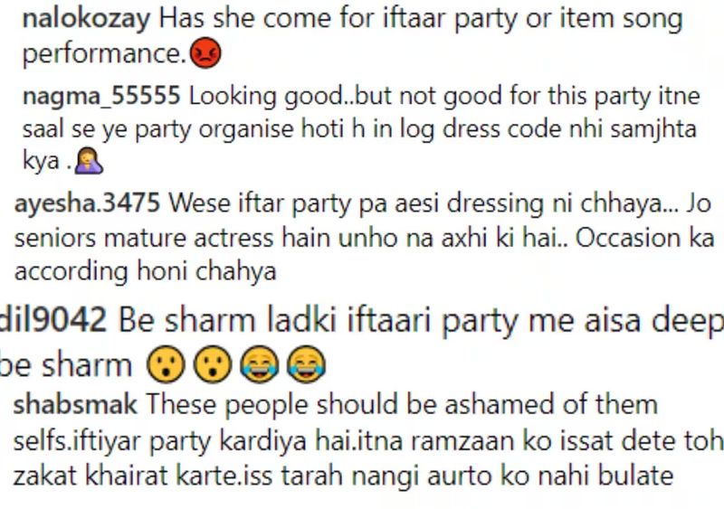 One user wrote, “Has she come for Iftar party or item song performance?" Another one said, “These people should be ashamed of themselves." A third user commented, “The theme is Iftar party, right? Why the dress like you’re going to a fashion show?"