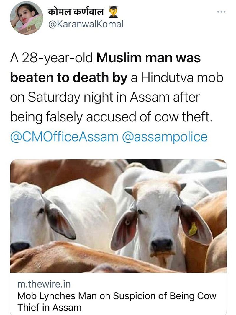 Outrage was expected over the crime. But the crime took a communal turn with the narrative being changed to, "28-year-old Muslim man beaten to death by a Hindutva mob in Assam's Tinsukia district".
