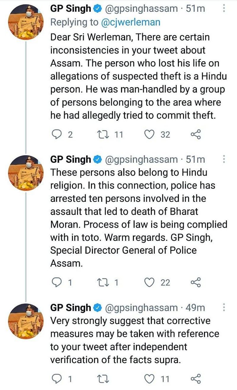 Special DGP Assam Police GP Singh clarified that the person who lost his life for alleged cow theft was a Hindu named Bharat Moran and that media outlets had wrongly identified him Sarat Moran.