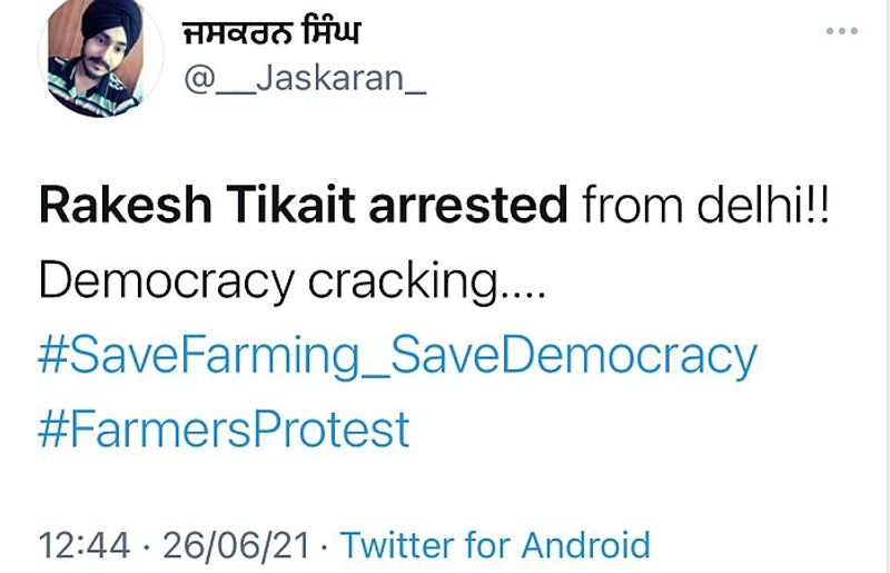 Messages were circulated that Bharatiya Kisan Union leader Rakesh Tikait was arrested by the police for carrying out a march.