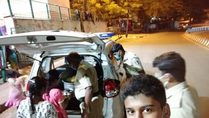 The cops and their team distributed food to the needy which was brought in their Hoysala.