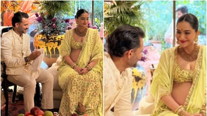 For the traditional puja ceremony, Sonam chose a vibrant lime green lehenga adorned with delicate floral motifs across the outfit. The ensemble beautifully highlighted her baby bump while maintaining an elegant and festive charm.