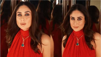 For the evening, Kareena embraced high-fashion glamour in a bold red Valentino jumpsuit. The high-neck silhouette with a tie-up detail gave her look a sharp, elongated finish. She paired it with matching pointed-toe heels, keeping the palette cohesive. A rose gold necklace with a green gemstone pendant added contrast, while her signature smoky eyes and soft curls balanced drama with elegance.
