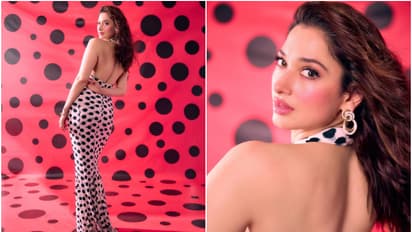 The striking gown featured paint-dot detailing — a signature element of the label — which lent a playful charm to the glamorous silhouette. Styled by Shaleena Nathani and Samridhi Jain, the outfit’s figure-enhancing design accentuated Tamannaah’s curves perfectly. The dramatic criss-cross halter neckline, open-front cut, and fishtail hem together infused the look with allure and sparkle.