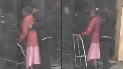 The short video shows the elderly woman slowly walking towards a house with the help of a walker. She appears weak and dependent on support to move. Moments later, the younger woman suddenly grabs her by the hair and drags her inside while hitting her.