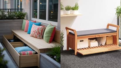 Balcony Storage Furniture: To make a small balcony stylish and organized, multi-purpose storage ottomans, wall-mounted cabinets, storage bench seats, and multi-level furniture are great options. Get both seating and storage on a budget.