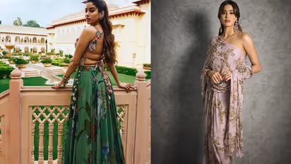Janhvi Kapoor stuns in a white off-shoulder gown adorned with subtle polka dots, radiating timeless elegance. The minimal print keeps the look sophisticated, while diamond earrings and soft makeup add a touch of modern glam. Perfect for festive occasions like Diwali, this saree gown style can be easily recreated at home with budget-friendly polka dot fabric for a chic yet affordable statement