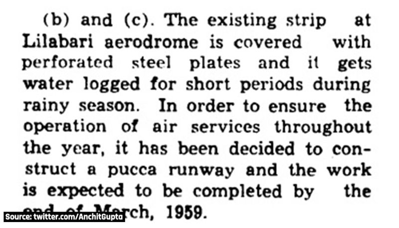 North East India was flush with airstrips (mostly 'kucha') made by the tea planters. These were later upgraded and used by the Air Forces (US/ Commonwealth) during the World War II Burma Operations. Post-war, most of these were declared surplus to military use, and even the Directorate General of Civil Aviation, Lilabari was no different.
