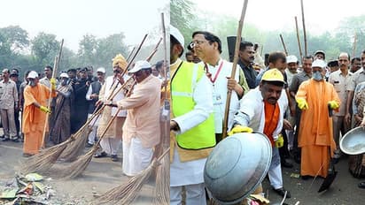 Yogi accompanied by dozens of officials and police commandos wore yellow gloves, a white cap and an anti-pollution mask to sweep litter at the west gate of the Taj Mahal along with 500 BJP members.