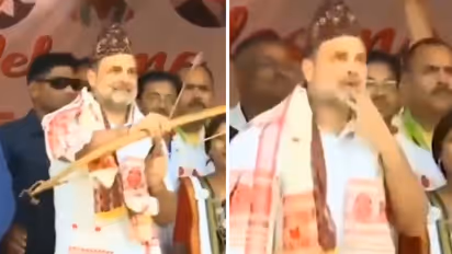 Congress leader Rahul Gandhi's response to trying out archery during a campaign event in Assam has gone viral on social media. Gandhi is seen on stage, attempting traditional archery in front of party members and passersby. He takes aim and launches the arrow while wearing his distinctive white shirt and pants, as well as a traditional Assamese gamcha and hat. His approach to the bow and arrow has become a subject of widespread discussion online.
