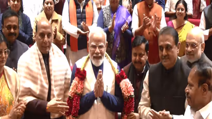 The BJP workers felicitated Prime Minister Narendra Modi with chants of "Jai Modi," "Vande Mataram," and "Bharat Mata ki Jai" after the Prime Minister secured the trade deal with US President Donald Trump at the NDA Parliamentary party meeting underway in Parliament premises on Tuesday.