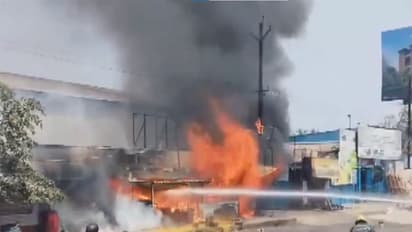 Fire broke out at an oil shop on Poonamallee High Road in Chennai on Thursday. Fire tenders reach the spot, no casualties reported. More details are awaited. (ANI)