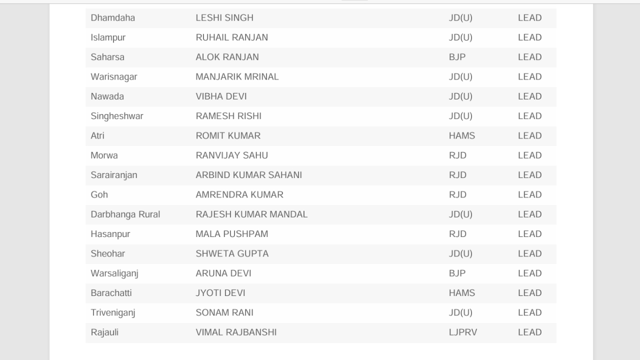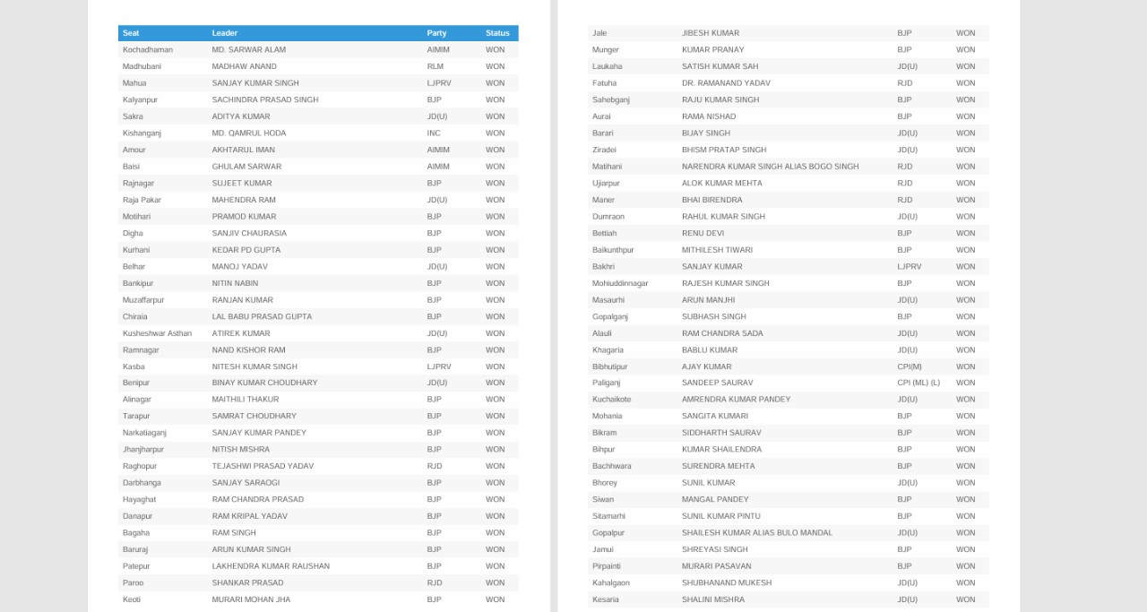 The National Democratic Alliance (NDA) has achieved a decisive victory in the Bihar Assembly elections, surpassing the 122-seat threshold required to form the government. According to the latest updates, the NDA has secured 152 seats, while the Mahagathbandhan has won 21. Within the alliance, the Bharatiya Janata Party (BJP) has emerged as the largest party with 76 seats, followed by the Janata Dal (United), which has claimed 59 seats. The Lok Janshakti Party (Ram Vilas) has also delivered a strong performance, winning 14 of the 29 seats it contested. On the opposition front, the Rashtriya Janata Dal (RJD) has captured 16 seats, while the Indian National Congress has won 3 seats so far.