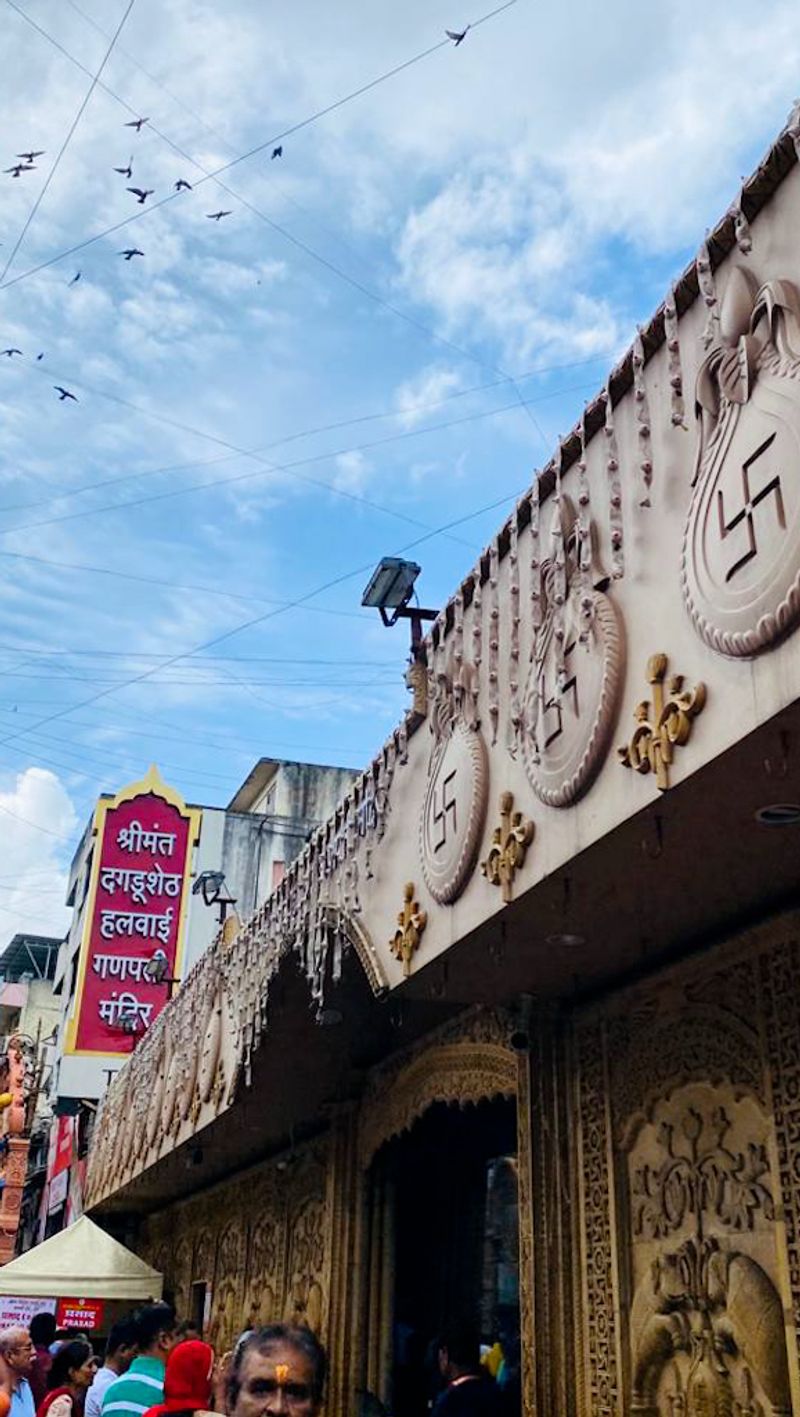 In its 121st year, the Dagdusheth Ganpati has been housed within a pandal that resembles a replica of the Ram Mandir. The imposing pillars lit up with chandeliers don't give the impression of a make-shift pandal. In fact, one may actually believe that they are in an actual temple.