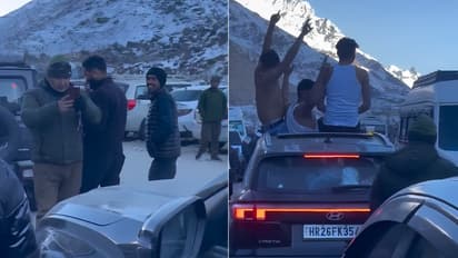 A video widely shared on X shows three men standing through the sunroof of a moving car, one of them half-naked. The men are seen enjoying the weather, dancing to loud music and one of them appears to be holding a glass containing an alcohol-like liquid. In the viral video, the men quickly rush back inside the car when an official, believed to be a local authority figure, approaches and clicks a photograph of the vehicle's number plate. The car carries a Haryana registration number.