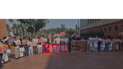 Opposition MPs on Thursday staged a protest against the India-US interim trade deal at the Makar Dwar of Parliament in the national capital. Opposing the trade deal between India and the US, opposition MPs called it a "trap deal" and held placards. The opposition also protested in favour of the Bharat Bandh called by trade unions to oppose various central policies.