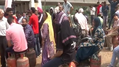 Long queues were seen outside LPG distribution points in Naushera, Jammu and Kashmir, on Tuesday as people faced a shortage of cooking gas. Residents, including women and children, waited for several hours to get LPG cylinders.