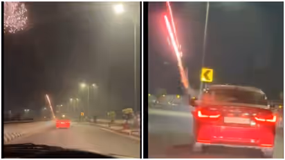 A video has surfaced online, showing an unidentified man launching sky-shot firecrackers from a moving car on Hyderabad’s bustling PVNR Expressway. The viral footage captures a red vehicle cruising along the elevated roadway while a man repeatedly bursts fireworks, sending sparks into the air and triggering serious safety concerns.