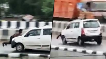A hair-raising video of a man being dragged on a speeding car's bonnet on an Uttar Pradesh highway has gone viral and left netizens in shock. The episode occurred on Monday evening when a truck and car crashed on the Lucknow-Kanpur flyover, followed by a quarrel between the car passengers and the truck driver. When the argument intensified, the angry youths attempted to hit the truck driver standing in front of them. But he dived on the bonnet and grasped the wiper tightly. Then the youth speeded the car on the flyover.
