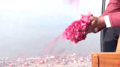 Flower petals were showered on the devotees who arrived for a 'snaan' at the Sangam in Prayagraj on the occassion of Mauni Amavasya. Visuals show a helicopter showering flower petals on the large gathering of devotees present on the Ghat for a holy dip during the ongoing Magh Mela.