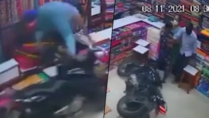 An out-of-control motorbike smashed into a clothing store in Telangana has emerged on social media. The CCTV video starts with a group of four people talking inside the cloth store. Then a Bajaj Pulsar bike smashed the doors and entered the shop straight towards the group. However, people inside the store managed to get out of the vehicle's way in the nick of time.
