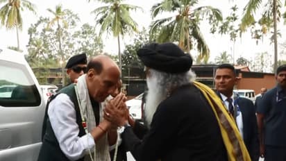 Defence Minister Rajnath Singh has arrived at Isha Yoga Centre in Coimbatore to attend the Maha Shivaratri celebrations this evening as the Chief Guest. Upon his arrival, the Defence Minister was welcomed by spiritual guru and founder of the Isha Foundation, Sadhguru Jaggi Vasudev.