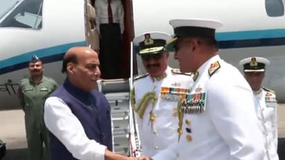 Defence Minister Rajnath Singh on Friday landed in Visakhapatnam to attend the commissioning ceremony of INS Taragiri and Aridhaman. The Defence Minister was welcomed by Indian Navy chief Admiral Dinesh Kumar Tripathi.
