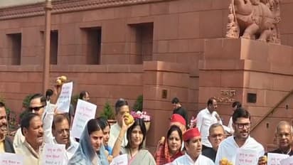 The Samajwadi Party MPs led by Dimple Yadav on Tuesday staged a 'potato protest' outside Parliament, demanding fair prices for farmers. The Samajwadi Party MPs brought potatoes to the Parliament premises and held a protest with banners reading, "Aloo ka uchit mulya dilao, kisaason ko yoon na satao" (Give a fair price for potatoes, don't harass farmers).