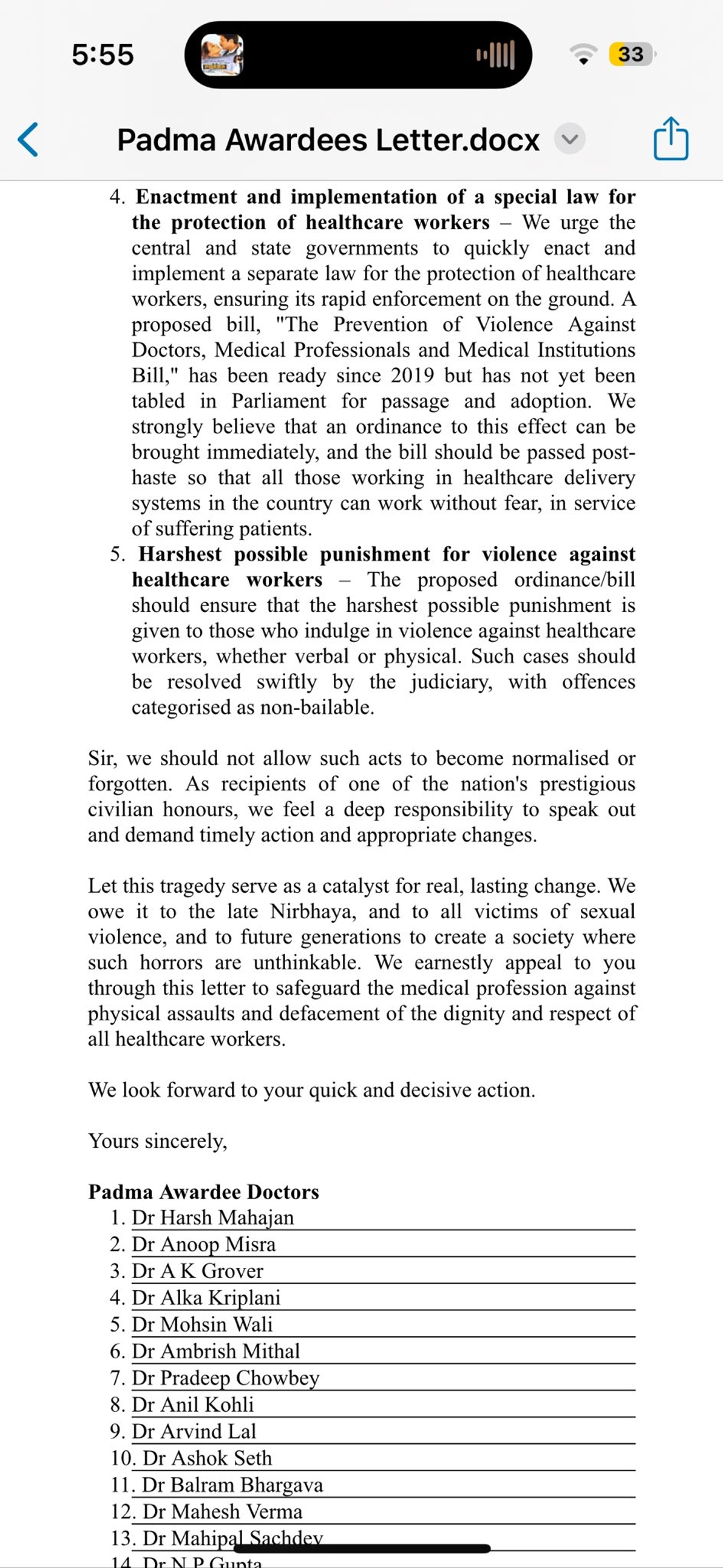 The letter, signed by prominent figures including radiologist Dr. Harsh Mahajan, former AIIMS Director Dr. Randeep Guleria, ex-ICMR Director General Dr. Balram Bhargava, and neurologist Dr. M V Padma Srivastava, among others, expresses the shock and outrage felt by the medical community.