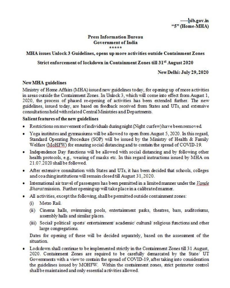 The Ministry of Home Affairs on July 29 issued guidelines for Unlock Phase 3, beginning from August. The new guidelines are based on feedback received from states and UTs. Here are a few key points.