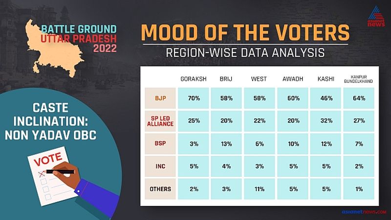 Kashi region: In Kashi, 68 per cent of Brahmin voters are in favour of going along with the BJP in the next election. The survey found only 25 per cent of voters backing the Samajwadi Party, followed by five per cent for the BSP and two per cent with Congress.