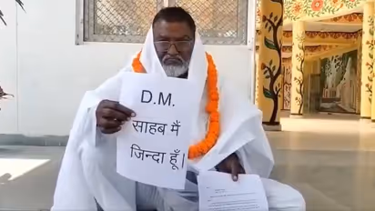 A man in Uttar Pradesh’s Basti district has gone viral after staging his own “death” to prove he is alive to protest against alleged bureaucratic negligence. The incident unfolded at the district magistrate’s office, where the elderly man, wrapped in a white shroud (kafan) and adorned with a garland, lay motionless on the ground, mimicking a corpse. In a dramatic twist, he suddenly “came back to life,” holding up a handwritten message that read, “DM Saheb, I am alive.”
