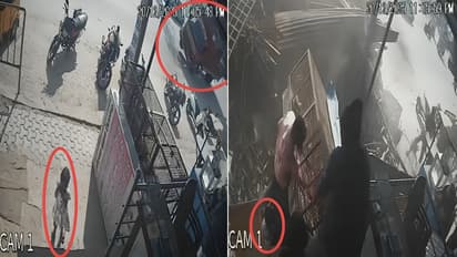 Within seconds, local people rush to the spot. A man is seen lifting the fallen metal rack and pulling the child out.