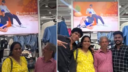 In the now-viral video, Adarsh leads his parents into the store and gestures to a giant banner over a clothes aisle. The ad shows him modelling sportswear for the brand's "active wear" range.
