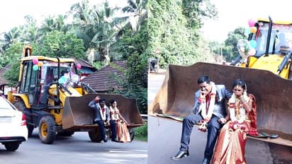 An amusing incident transpired in Puttur city of Dakshina Kannada district, Karnataka, where a groom took the wedding procession in a unique style. The groom, Chetan, who works as a back-end (JCB) operator, preferred to take his wedding procession on a JCB.