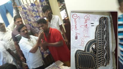 We have got the photos of a large cake with a giant design of a gun on top was cut by the murder accused Kyate Chetan.