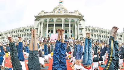 The attempt is to break the record set by Chennai Yoga practitioners last year. A practice session was held on Sunday in front Vidhana Soudha. Earlier in the day at 6.30 am, Governor V R Vala flagged off to mark the beginning of the exercise and wished the participants.